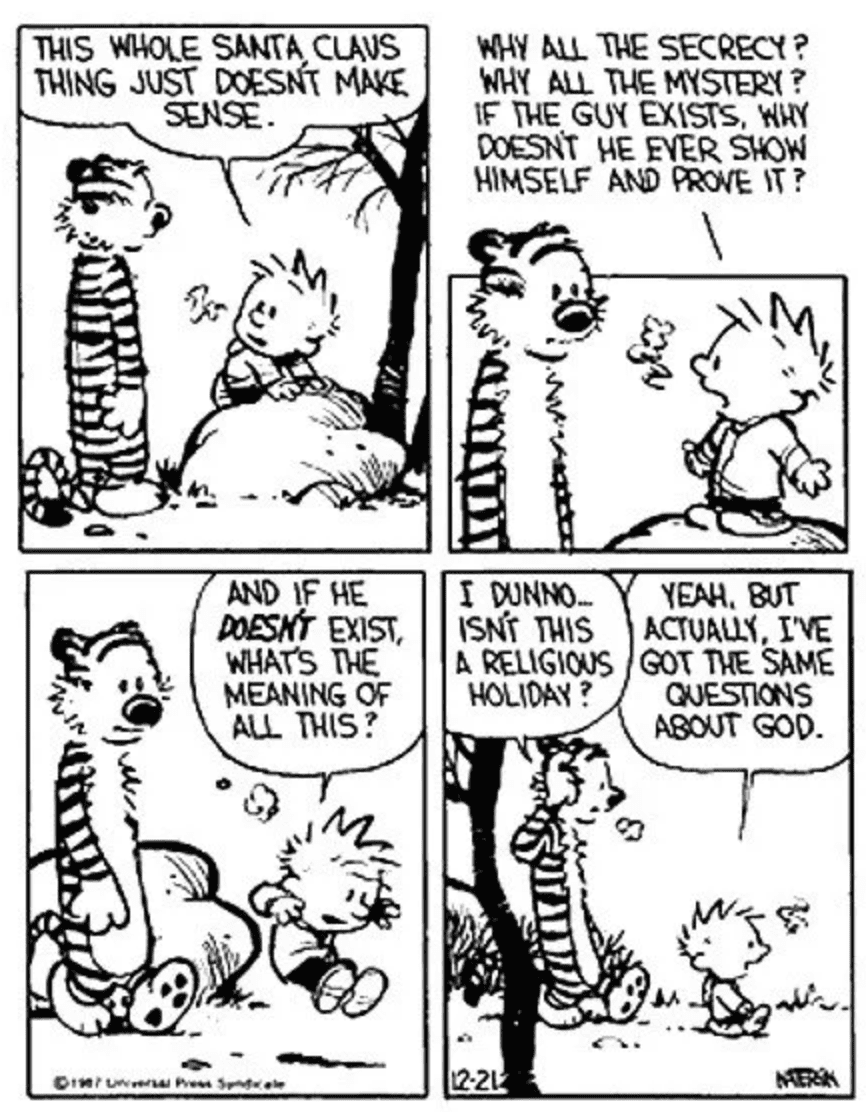 And so I did, gradually turning those little canned prayers into nightly, long-form conversations with God. As the years went by – and particularly after our family was blown to smithereens and I spent long stretches of time in abject loneliness – I turned to God. I was Calvin and God was my imaginary Hobbes.